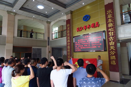 圖為市水務(wù)局機關(guān)黨員在市防指指揮大廳重溫入黨誓詞